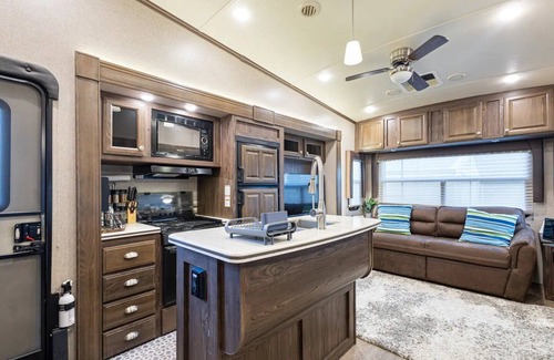 Once inside, you will notice the high ceilings that make the camper feel very spacious. This sweet RV sleeps up to 5 comfortably. Glamping with 2 air conditioning, heat, hot water, full kitchen with all the essentials to make getting going in the morning super easy. There are tv’s in the common area and bed room. Memory foam mattress in primary bedroom is super comfy. Patio area has an outside entertainment feature for you to enjoy.